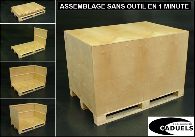 La Caisserie des Caduels a mis au point un nouveau système d'assemblage breveté simple, rapide et réutilisable, qui permet un montage sans outil, d'une caisse, en moins d'une minute.