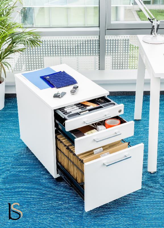 Nous vous proposons ici un caisson mobile tout en un, en effet, en choisissant ce modèle, vous disposerez d'une tirette plumier, d'un tiroir classique et d'un compartiment pour les dossiers suspendus.