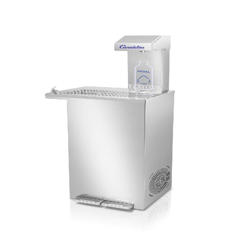 Fontaine réseau pratique et hygiénique pour remplir les bouteille ou boire directement grâce à des boutons de commande. Eau froide et tempéré. Pédale pour eau froide, pédale pour l'eau tempérée. Jet d'eau hygiénique au design breveté. Vis allen anti vandalisme. Grille non amovible pour raison de sécurité. En acier inoxydable intérieur et extérieur. Porte-Gobelets en option.