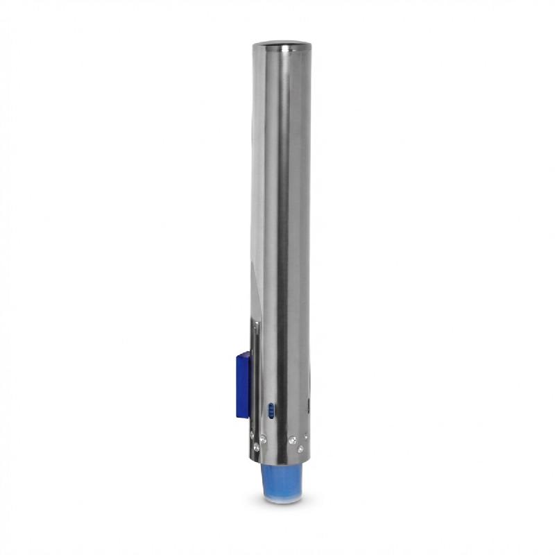 Porte-gobelets en acier inoxydable: colonne verticale. Grande capacité / 120 gobelets de 200 ml. Fixation murale ou à la fontaine. Témoin pour visualisation de la quantité restante dans le distributeur.