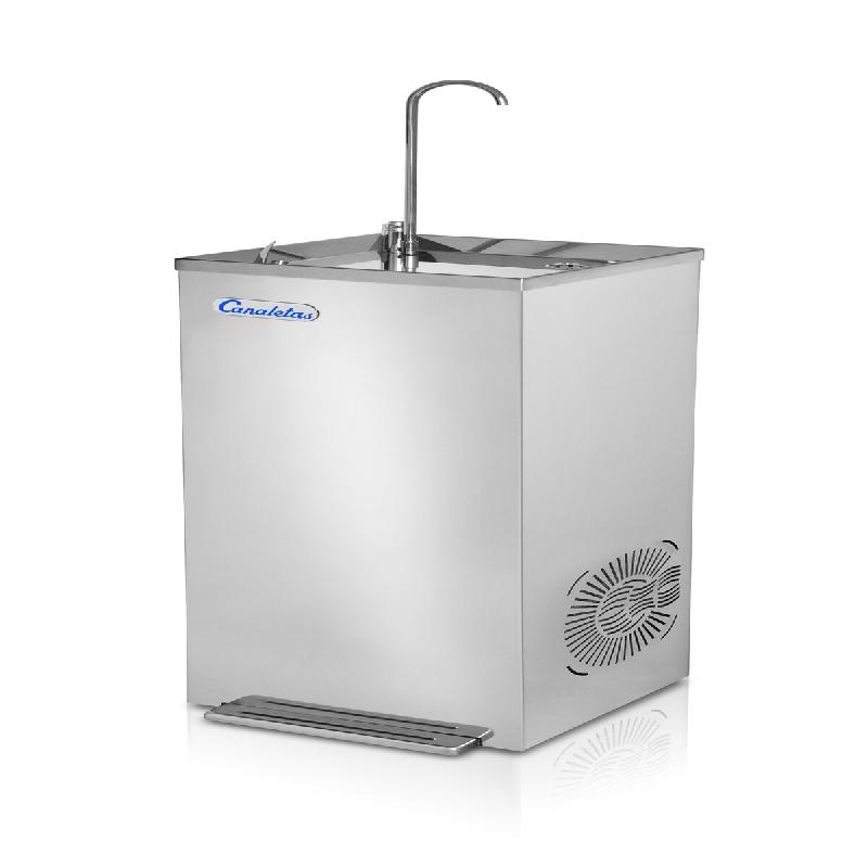 Fontaine réseau au débit d'eau fraîche remarquable grâce à sa capacité de réfrigération supérieure: jusqu'à 50 personnes à la suite. En acier inoxydable intérieur et extérieur, plateau supérieur plat pour poser tout type de récipients en toute sécurité, Col de cygne de 37 cm, protection du jet pour garantir l'hygiène, température d'eau pour froide facilement réglable grâce au thermostat. Col de cygne actionné par bouton poussoir pour l'eau froide, Jet à 3 températures : pédale pour eau froide, bouton poussoir pour eau tempérée, pédale et bouton pour mixer les 2.