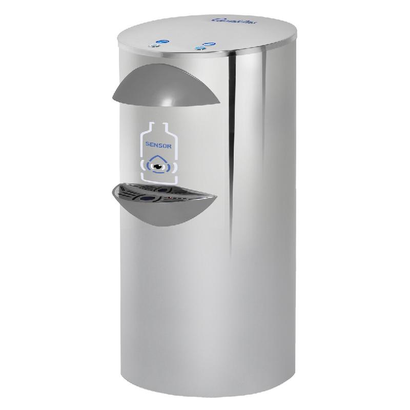 Design élégant pour cette fontaine à eau réseau en acier inoxydable intérieur et extérieur. Détection de présence de bouteille. Pour remplir un récipient, il suffit de la placer face au capteur frontal et de sélectionner l'eau désirée (froide, tempérée ou mixte) en appuyant sur le bouton. Cuvette de récupération d'eau. Hygiène renforcée avec la protection occultant le jet de service : contact manuel évité. Détente directe (acier inoxydable), Thermostat permettant le réglage de la température de l'eau. Hauteur de niche de distribution d'eau de 33 cm. L'utilisation de filtre est recommandée pour une meilleure qualité de l'eau et pour assurer la perennité de l'eau. Porte-Gobelets en option.