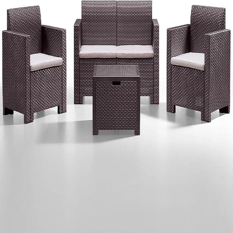 L'ensemble de salon de jardin Nebrasca en résine effet rotin comprend deux fauteuils, un canapé deux places et une table basse. Grâce à la qualité des matériaux utilisés, il allie fonctionnalité, design et grande résistance aux intempéries. Léger et résistant aux chocs et aux intempéries, cet ensemble est idéal pour le jardin ou l'extérieur.
