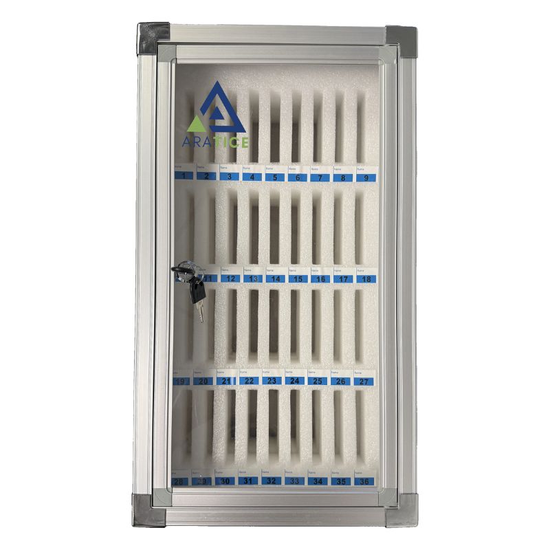 L’Araphone Box est une solution de rangement sécurisé permettant d’organiser et de protéger jusqu’à 36 smartphones, même lorsqu’ils sont équipés d’une coque, jusqu’à 6,9 pouces.