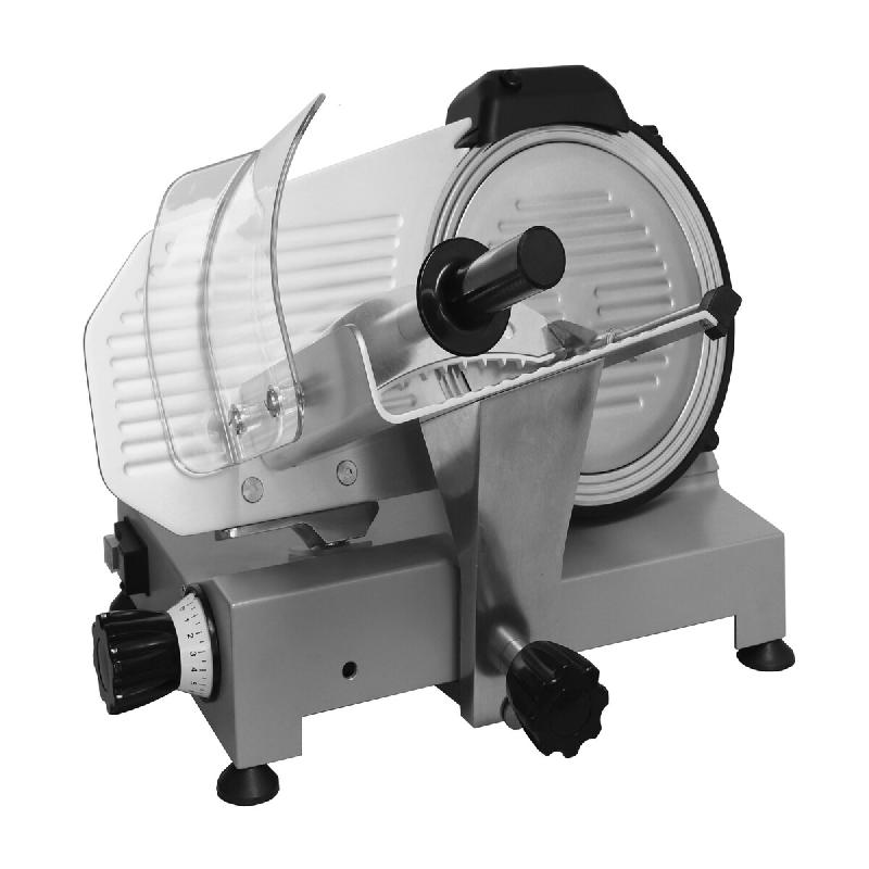 - Tension / fréquence : 230 V / 50 Hz - Puissance : 150 W - Matériau du boîtier : Aluminium (poli et anodisé) - Matériau de la lame : Acier spécial pour lames - Matériau des poignées : Plastique - Diamètre de la lame : 250 mm - Épaisseur de coupe : 0 - 8 mm (réglable en continu) -