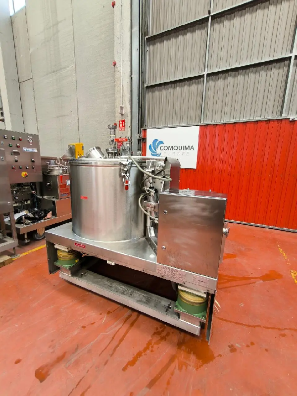 Centrifugeuse à panier à axe vertical avec décharge par le bas avec racleur monté. Modèle DZU 125 fabriqué par KRAUSS MAFFEI. Toutes les pièces en contact avec le produit sont en acier inoxydable AISI 316L Caractéristiques générales : Fabricant KRAUSS MAFFEI Modèle DZU 125 Type Centrifu
