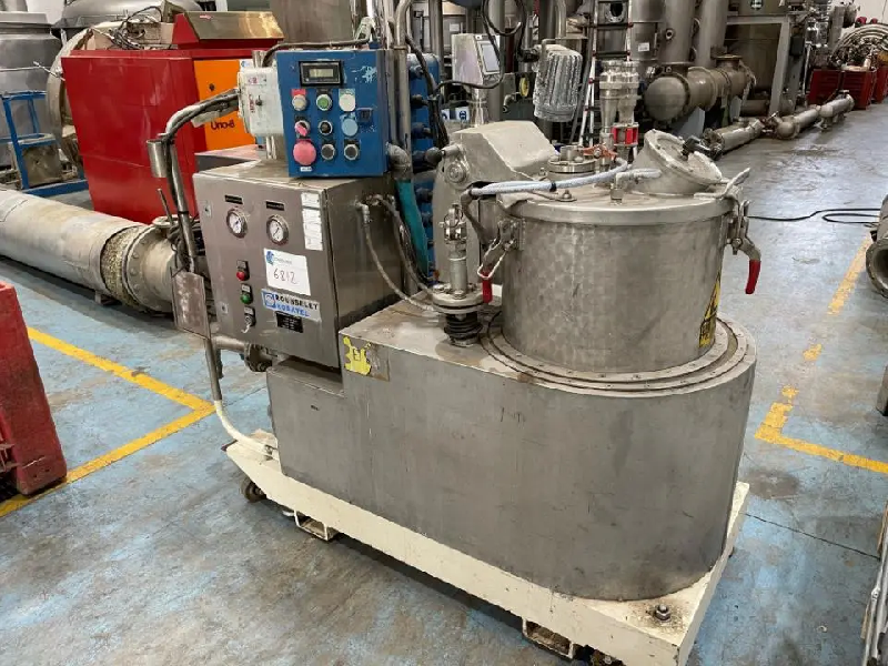 Centrifugeuse à panier à axe vertical à décharge supérieure d'occasion avec sac. Modèle RCR 40VXR fabriqué par ROUSSELET ROBATEL. Toutes les pièces en contact avec le produit sont en acier inoxydable 316L. Caractéristiques générales : Fabricant ROUSSELET ROBATEL Modèle RCR 40VXR Type ATEX Matériau Inox 316 Poids 800 Kg Couvercle à ouverture manuelle avec 3 fermetures réglables type K, tube de chargement, tube de lavage avec 5 buses, raccords entrée et sortie N2 pour inertage, voyant avec visualisation de la charge grille et bride de ventilation. Équipement avec panneau d'inertage, fermeture siphonique et panneau de commande.