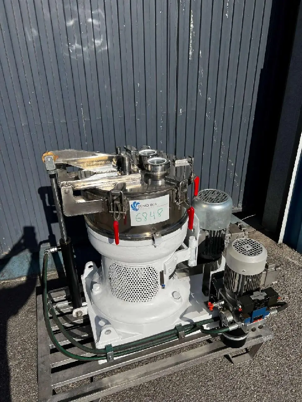 Référence: - C8876 - Centrifugeuse à panier à axe vertical à décharge manuelle par le haut montée sur plaque d'inertie avec silentblocs. Modèle SCA - 700 - Toutes les pièces en contact avec le produit sont en acier inoxydable 316L (sauf les joints). - Suspension : ressorts, rotules et t