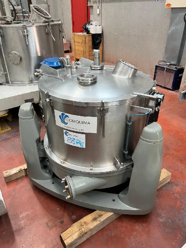 Centrifugeuse à panier à axe vertical à décharge manuelle par le haut montée sur plaque d'inertie avec silentblocs. Modèle SCA-700 Toutes les pièces en contact avec le produit sont en acier inoxydable 316L (sauf les joints). Suspension : ressorts, rotules et tirants Couvercle : 6 verrous de sécurité à ouverture manuelle Viseur de visualisation du chargement et voyant de lumière Tube de lavage Tube de chargement 2 connexions pour entrée et sortie Moteur électrique N2 5,5 kW