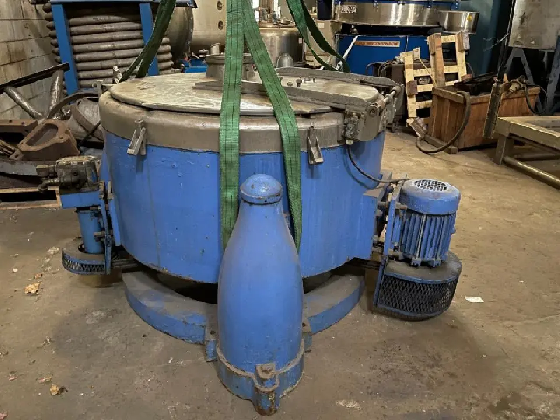 Centrifugeuse à panier à axe vertical d'occasion à décharge par le bas avec racleur monté sur trois pieds (avec tirants et ressorts de compression). Modèle 1250 fabriqué par FERRUM. Toutes les pièces en contact avec le produit sont en acier inoxydable AISI 316L. Caractéristiques généra