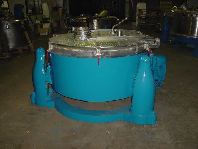 Référence : - C5621 - Centrifugeuse à panier à axe vertical d'occasion à décharge par le haut avec sac monté sur trois pieds (avec croisillons et ressorts de compression). - Modèle : FT - 10 - B - Fabricant : COMTEIFA - Caractéristiques générales : - Fabricant : COMTEIFA - Modèle