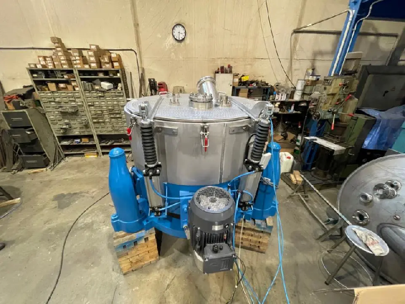 Centrifugeuse à panier à axe vertical d'occasion à décharge par le haut avec sac monté sur trois pieds (avec croisillons et ressorts de compression). Modèle FT-12-B fabriqué par COMTEIFA. Toutes les pièces en contact avec le produit sont en acier inoxydable 316L. Caractéristiques générales : Fabricant COMTEIFA Modèle FT-12-B Type Centrifugeuse à panier à axe vertical à décharge supérieure avec sac Matière Inox 316L Vitesse variable par convertisseur de fréquence. Ouverture totale. Toutes les pièces en contact avec le produit sont en acier inoxydable AISI 316L. Montage sur roulements à rouleaux très fortement dimensionnés. Boîtier de roulement en fonte. Frein d'arrêt électrique effectué par le convertisseur. Couvercle en acier inoxydable AISI 316L avec mouvement du piston compensé par ressort.