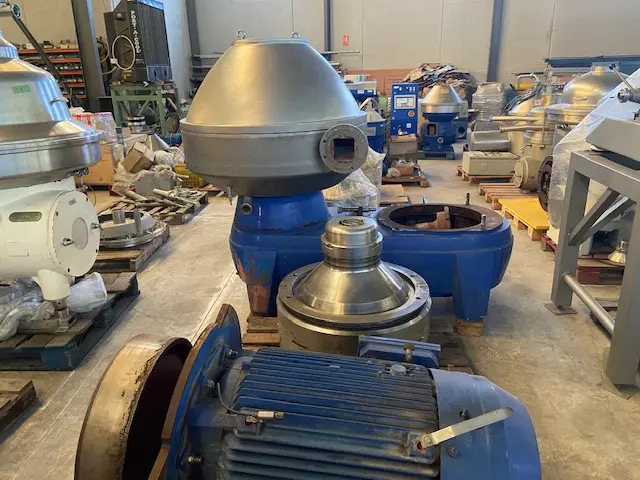 Centrifugeuse de clarification fabriquée par ALFA LAVAL, modèle BRPX 817. Capacité : jusqu'à 20 000 L/h avec un apport de pulpe de 12 % et un débit de 1,5 %. Nouveau tableau électrique en acier inoxydable avec convertisseur de fréquence et PLC avec écran tactile couleur. Nouveau banc de centrifugation. Nouvelles vannes d'entrée et de sortie de produits. Nouveau débitmètre électromagnétique. Nouveau groupe de soupapes de décharge.