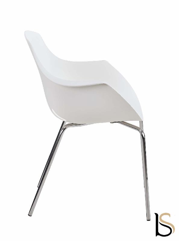L'assise est réalisée en polypropylène disponible dans trois finitions, elle repose sur une structure en acier finition chromée équipée d'embouts de protection au sol.