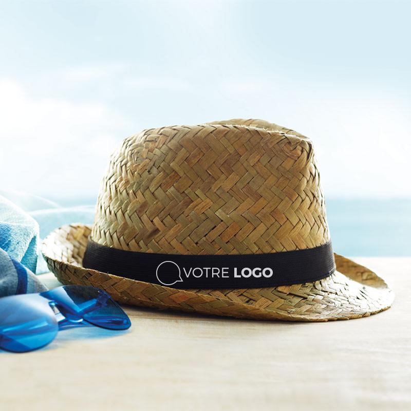 Chapeau de paille naturelle avec 2 bandes de couleur au choix. Bandeau élastique non cousu (livrée séparément en cas de commande sans impression).