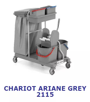 Chariot ARIANE 2115 - Equipé : - 1 base 95x53cm - 4 roues bandage dur 100mm - 4 rondelles pare - chocs - 1 support sac 120L - 1 bac latéral 50x19cm - 2 seaux 6L bleu, rouge - 2 seaux 15 bleu, rouge - 1 support presse - 2 supports manche - Couvercle et sac pour support sac en - option