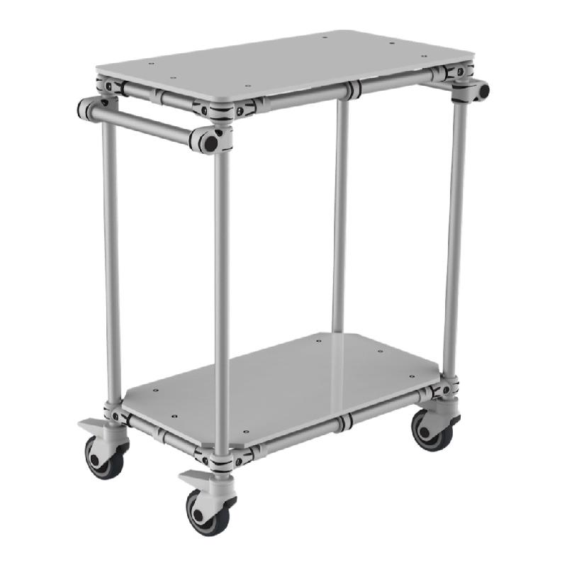 Desserte logistique usine compacte multi-usage équipé de 2 niveaux réglables en hauteur. Poignée ergonomique réglable en hauteur. Structure Aluminium légère et maniable. 2 roulettes pivotantes fixes et 2 roulettes pivotantes avec frein montées sur platines