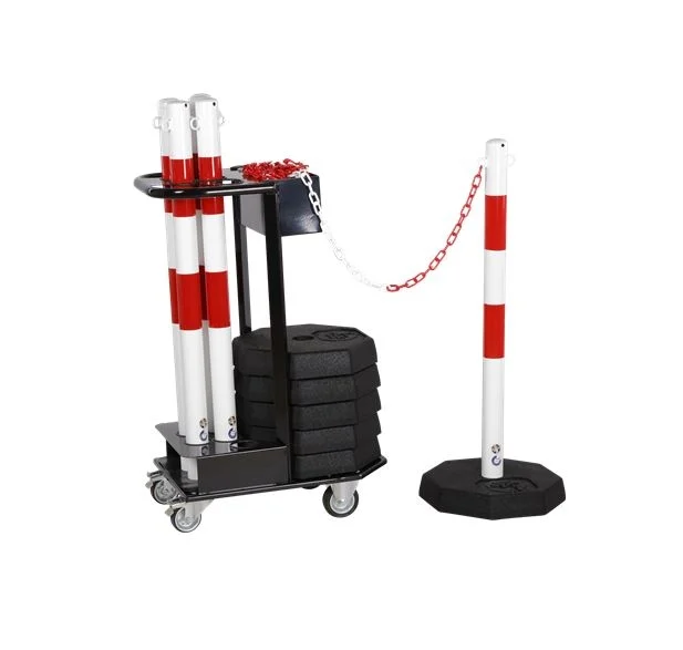 Balisage professionnel pour l' industrie avec un chariot de transport et de stockage équipé de 6 poteaux rouges et blancs plus chaîne.