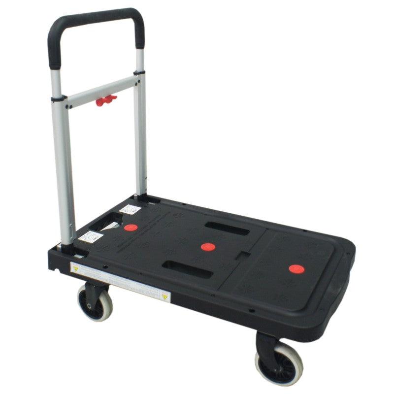 Chariot professionnel pour des livraisons ou du transport de matériel. Equipé de 4 roues dont 2 pivotantes, d'un fond renforcé et d'un plateau polypropylène avec patin antidérapant. Entièrement pliable pour stockage plus facile, poignée télescopique. Structure en acier.
