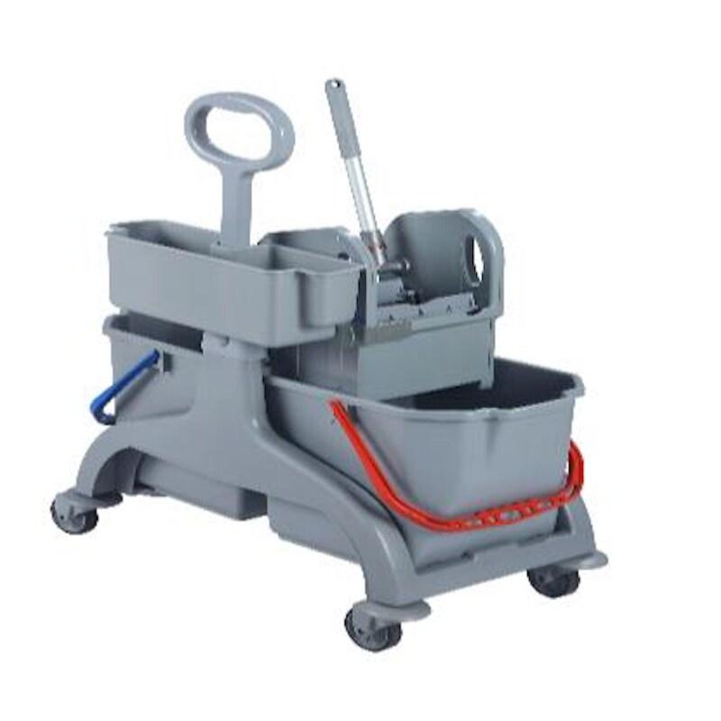 Équipé de 2 seaux 18 litres avec anses rouge et bleue, 1 presse à mâchoire et 1 porte produits. Couleur : Gris. Matériau du corps de base : PP (polypropylène). Poignée de poussée : Poignée en plastique. Seaux de presse : 2 x 18 litres.Roues : Plastique avec pare-chocs (4 x Ø75 mm). Dimensions du produit : Longueur: 80 cm / Largeur: 43 cm / Hauteur: 84 cm.