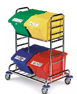 Chariot permettant d'accueillir 16 bacs répartis sur 4 plateaux. Les plateaux supportent une charge de 60 kg. Les dimensions des bacs sont les suivantes Lxlxh : 500(haut)/450(bas) x 312 x 200 mm. L'ensemble du chariot est mécano - soudé et boulonné. Le chariot est équipé de 4 roues pivotantes