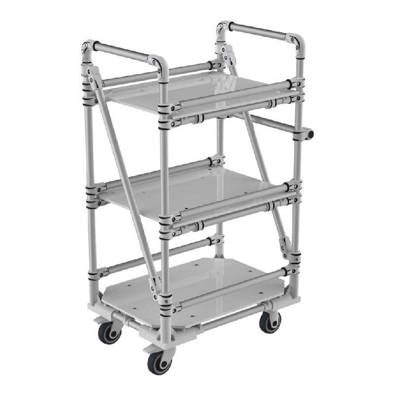 Chariot compact multi-usage équipé de 3 niveaux réglables en hauteur et inclinaison . Poignée ergonomique réglable en hauteur. Butées anti-chutes avant et arrières. Structure Aluminium légère et maniable. 2 roulettes pivotantes fixes et 2 roulettes pivontants avec frein montées sur platine.