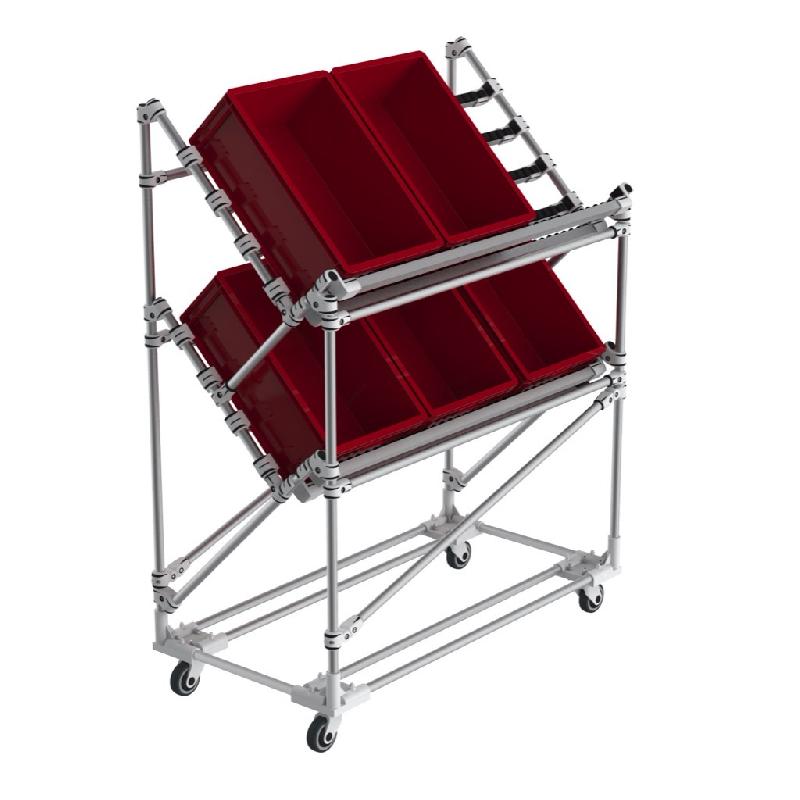 Convoyeur modulaire et évolutif en V. 2 niveaux. Réglable en hauteur. Structure tubulaire robuste et ajustable. Niveaux réglables en inclinaison et hauteur au sol. Structure en aluminium légère et resistante. Montage sur roulettes