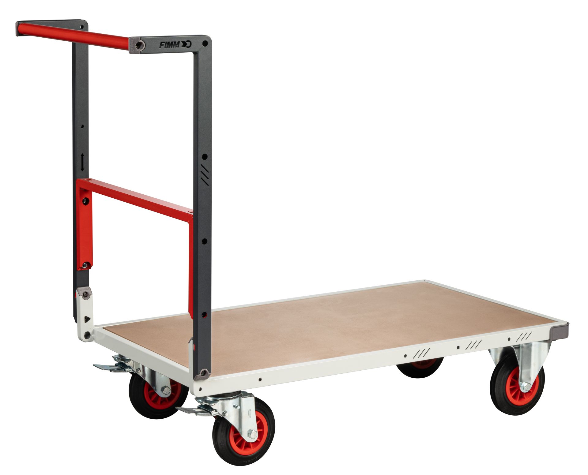 Chariot de manutention L1190mm avec dossier rabattable équipé de - > Plateforme bois épaisseur 10 mm dimensions utiles L.1060 x l.600 - > 2 roues fixes et 2 pivotantes ø 160 mm. - > Dossier rabattable. - > Structure en tube d'acier laqué. Diamètre 30mm. - Caractéristiques techniques