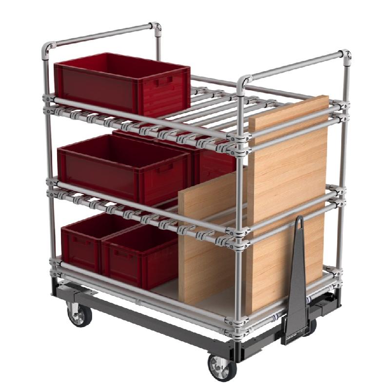 Chariot modulaire Tractable avec timons d'accroche avant et arrière. Structure supérieure avec rails à galets FIFO pour picking facile .Niveaux réglables en hauteur. Structure supérieure en Aluminium. Charge 150 Kg par niveau. 3 Niveaux. Monté sur embase roulette platine : 2 Roulettes pivotant