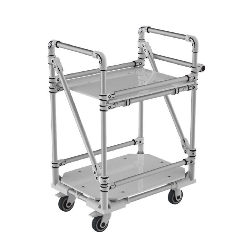 Chariot compact multi-usage équipé de 2 niveaux réglables en hauteur et inclinaison . Poignée ergonomique réglable en hauteur. Butées anti-chutes avant et arrières. Structure Aluminium légère et maniable. 2 roulettes pivotantes fixes et 2 roulettes pivontants avec frein montées sur platine.