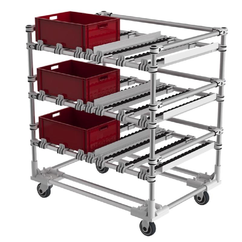 Chariot modulaire . Structure fermée anti-chutes sur 3 cotés avec stop bas en facade pour picking facile. Structure rails à galets FIFO . , Idéal pour cartons, boites et KLT. Niveaux réglables en hauteur. Charge 150 Kg par niveau. 3 Niveaux. Monté sur embase roulette platine : 2 Roulettes pivotantes et 2 roulettes pivotantes avec frein.