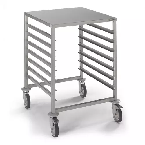 Chariots hauts et bas avec glissières pour bac gastronorm.Bénéfices - Chariots soudés avec structure à tubes carrés inox AISI 304 de 25 x 25 x 1.2 mm. - Glissières inox AISI 304 en "C" avec butée arrière. - Roues Ø125 mm dont 2 avec frein. - Pare - chocs en caoutchouc. - Chariots bas