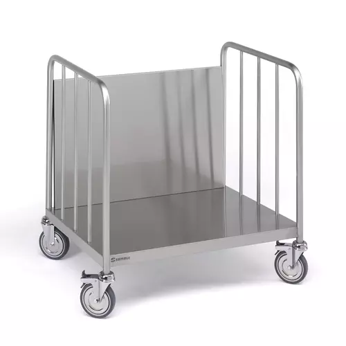 Chariot de transport - Dimensions des étagères : 800 x 500 mm - Matériau : Inox AISI - 304 18/10 satiné - Structure : Renforcée, très résistante - Étagères : Insonorisées, très robustes et sans arête coupante - Roues : 4 roues pivotantes de diamètre 125 mm, dont 2 équipées de fre