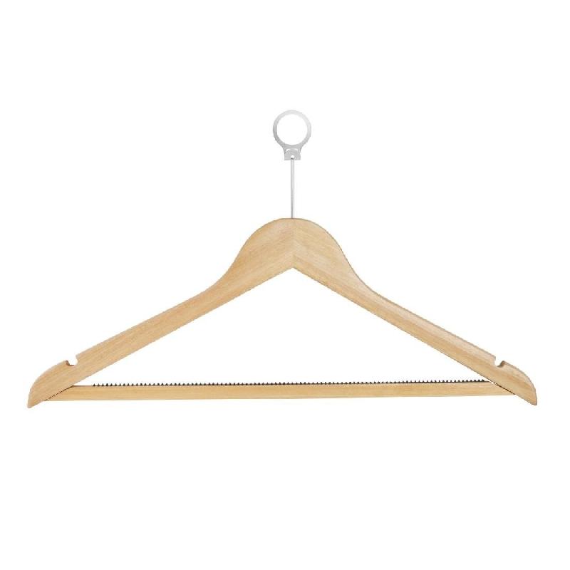 Cintres en bois avec conception antivol, fournis avec un anneau pour fixer le cintre à la tringle. Comprend des encoches et une barre antiglisse pour les pantalons. Idéal pour les hôtels, les chambres d'hôtes et les vestiaires - Produit livré non monté, montage à la charge du client