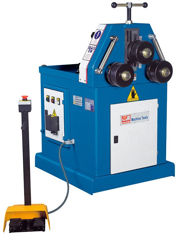 Caractéristiques principales : - - Ø d'arbres : 30 mm - Ø galet supérieur : 98 mm - Ø galets inférieurs : 118 mm - Dimensions (L x l x h) : 700 x 700 x 1400 mm - Poids net (brut) : 230 kg (300 kg) - Description : - Cintreuse à galets motorisée pour le cintrage de profilés -