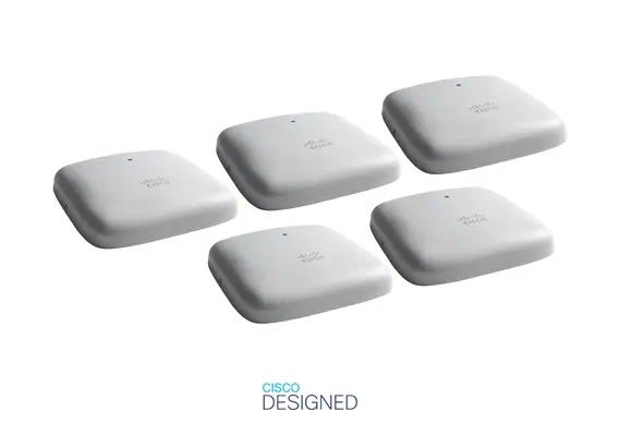 Le multipack de cinq points d'accès Cisco Business 240AC offre une connectivité sans fil à haute densité MU-MIMO (4x4) pour permettre à une PME de démarrer rapidement. Conçue dans un souci de simplicité, de flexibilité et de sécurité, le lot Cisco Business 240AC offre des performances supérieures et une portée accrue pour une expérience utilisateur optimale.