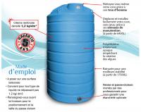Cuve renforcée densité 1.2 kg/ dm3, polyéthylène totalement opaque empêchant la formation d'algues, déplacez et installez facilement grâce à ses anneaux de levage, passe cloison monté par des professionnels pour vous garantir une étanchéité optimale, trou d'homme renforcé avec couvercle vissé event intégré...