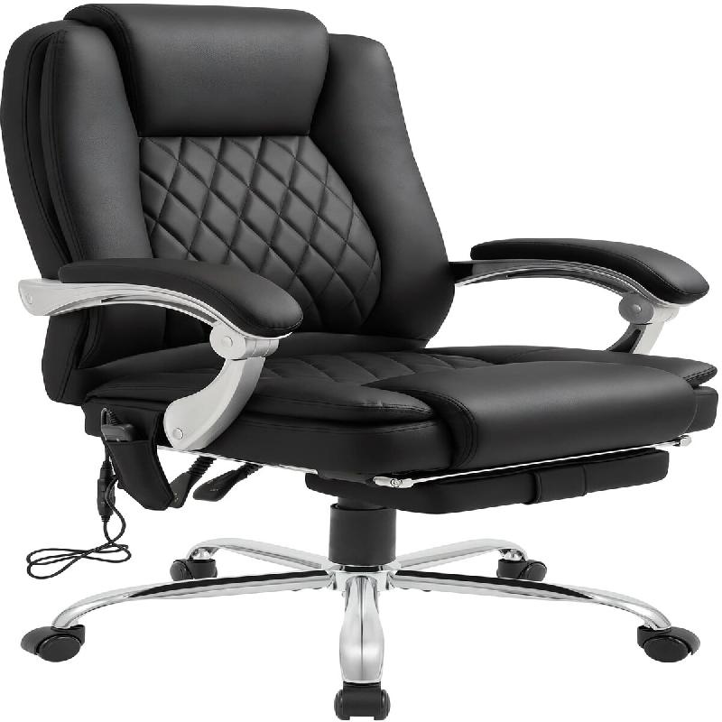 La structure en métal robuste chromé assure une stabilité jusqu'à 150 kg. Les roulettes en PU et la construction pivotante offrent flexibilité et mobilité au travail. Les accoudoirs rembourrés et le repose-pieds escamotable augmentent le confort, complété par le noyau à ressorts ensachés ergonomique et le revêtement en simili-cuir résistant.