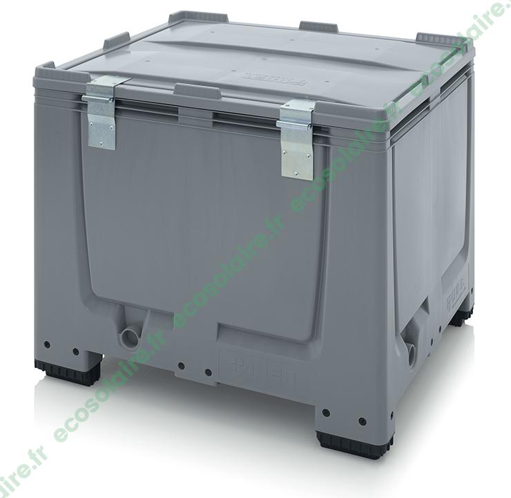 Bac avec couvercle intégré bleu type bac crocodile - Emboitables lorsque le couvercle est ouvert - Empilables lorsque le couvercle est fermé - Options : bac sans couvercle, plombs de scellé, pochette autocollante, barres de gerbages, roues pivotantes, semelle inférieures. - Avec couvercle