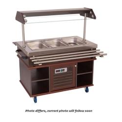 Gaz réfrigérant r134a température 2°c/10°c éclairage intégré bacs en acier inoxydable prévu pour bacs de 150 mm de profondeur étagères plan de travail en granit parois latérales et corps en bois couleur noyer 4 roulettes (2 avec freins) capacité : 3 bacs gn 1/1 (non fournis) puissance (