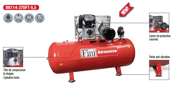 - Réservoir capacité (L) : 270 - Puissance (CV) : 5,5 - Débit d'air réel : 30 m³/h - Débit d'air engendré : 40 m³/h - Tête de compression : Cylindre en fonte pour une durée de vie accrue. Panneau de contrôle : Commande centralisée avec lecture directe. Accessibilité : Totale et simp