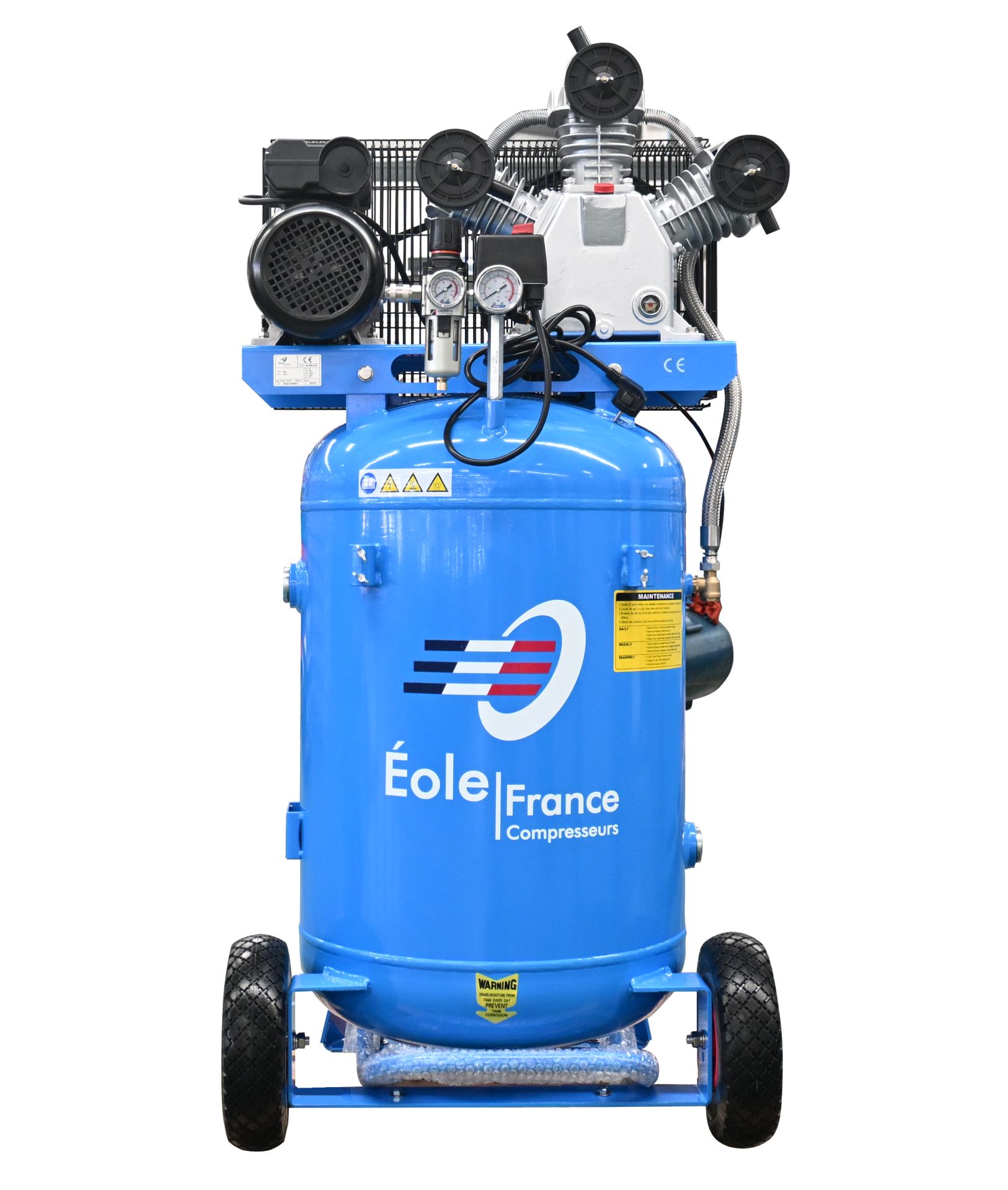 Sa conception compacte (dimensions : 666 × 557 × 1371 mm) et son poids de 127 kg facilitent son intégration dans tous types d’espaces, tandis que sa cuve verticale de 150 litres garantit une réserve d’air importante pour des utilisations prolongées.