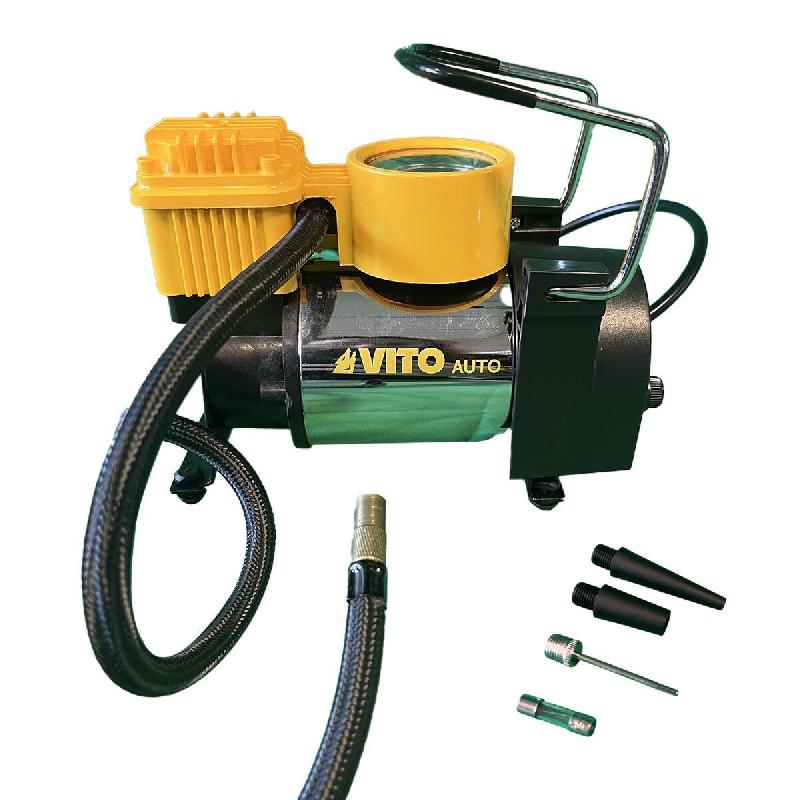 Le mini compresseur portable VITO est l'outil idéal pour le gonflage rapide et efficace des pneus de voiture, des vélos et de divers équipements gonflables tels que les bouées et les matelas. Avec sa puissance de 140W et une pression maximale de 10 bars (115 PSI), ce compresseur offre des performances fiables dans un format compact et portable. Son débit d'air de 35 L/min assure un gonflage rapide et précis, tandis que sa conception légère et pratique le rend facile à ranger et à transporter, que ce soit à la maison ou dans le coffre de votre voiture.Caractéristiques principales :- Puissance : 140W- Débit d'air : 35 L/min- Pression maximale : 10 bars / 115 PSI- Dimensions : 190 x 90 x 150 mm- Poids : 1.9 kgAvantages du produit :- Polyvalence : Convient pour gonfler les pneus de voiture, les vélos, ainsi que les équipements gonflables tels que les bouées et les matelas, offrant une solution polyvalente pour divers besoins de gonflage.- Compact et portable : Son design compact et sa légèreté permettent un stockage facile dans n'importe quel endroit, que ce soit à la maison, dans le garage ou dans le coffre de votre véhicule.- Facilité d'utilisation : Doté de raccords de sortie rapide, le mini compresseur VITO offre une utilisation simple et pratique, idéal pour les utilisateurs novices et expérimentés.- Accessoires inclus : Livré avec ses embouts et son sac de transport, cet ensemble complet vous offre tout ce dont vous avez besoin pour commencer à gonfler dès sa réception.Applications recommandées :- Gonflage des pneus de voiture- Gonflage des pneus de vélo- Gonflage de bouées et matelas gonflables- Utilisation domestique et automobile