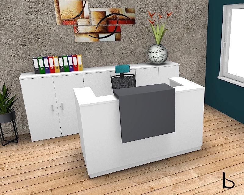 A noter également que cette banque d'accueil dispose de tout un programme de rangement tels que les caissons, les armoires de bureau.