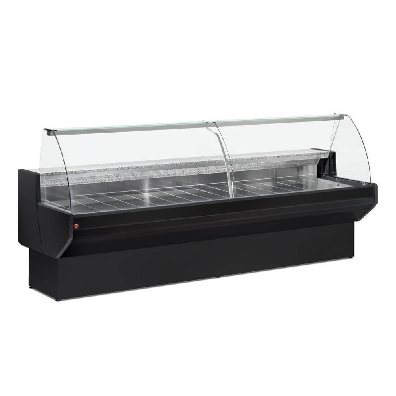 Caractéristiques principales : - Vitre frontale bombée, relevable à piston hydraulique (soft contact), toutes en verres trempés. - Exposition en acier inox AISI 304. - Éclairage uniforme. - Prise 230V/1 de service. - Réalisation extérieure en tôle plastifiée, joues en ABS. - Plan de t