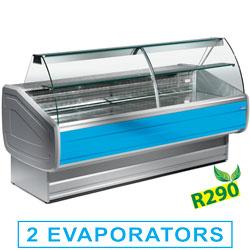 Caractéristiques principales : - Vitres bombées rabattables en verre trempé. - Vitre intermédiaire, éclairage vitrine de type TL. - Réalisation extérieure en tôle plastifiée, joues en ABS, plan de travail en granit, prise 230V/1. - Exposition en acier inox AISI 304. - Régulateur élec