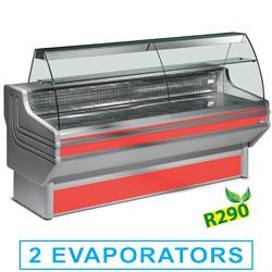 Caractéristiques principales : - Vitres bombées rabattables : toutes en verre trempé. - Exposition en acier inox AISI 304. - Vitre intermédiaire, éclairage vitrine de type NEON. - Réalisation extérieure en tôle plastifiée, joues en ABS, plan de travail en granit, prise 230V/1 de service