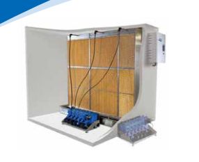 L'eau du robinet ou traité par osmose inverse est pompée jusqu'au sommet du module d'évaporation. A mesure que l'air traverse le module, il est humidifié et rafraichi sans gouttelettes. La combinaison des modules d'évaporation s'adapte à la section considérée dont la taille peut varier de 0.6m à 4.2 m de largeur, et de 0.625 m à 3 m de hauteur.