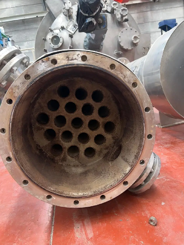 Échangeur tubulaire vertical en inox d'une surface d'échange de 60 m2 - MatérielAcier inoxydable 316/316L - Caractéristiques techniques - Passages dans la Coque : 1 - Passages dans les Tubes : 1 - Nombre de Tubes : 320 - Dimensions - Diamètre de la coque : 540 mm - Longueur des tubes :