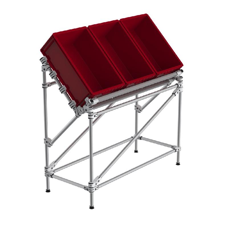 Convoyeur modulaire et évolutif en V. 1 niveaux. Réglable en hauteur. Structure tubulaire robuste et ajustable. Niveaux réglables en inclinaison et hauteur au sol. Structure en aluminium légère et resistante. Montage sur pieds réglables au sol